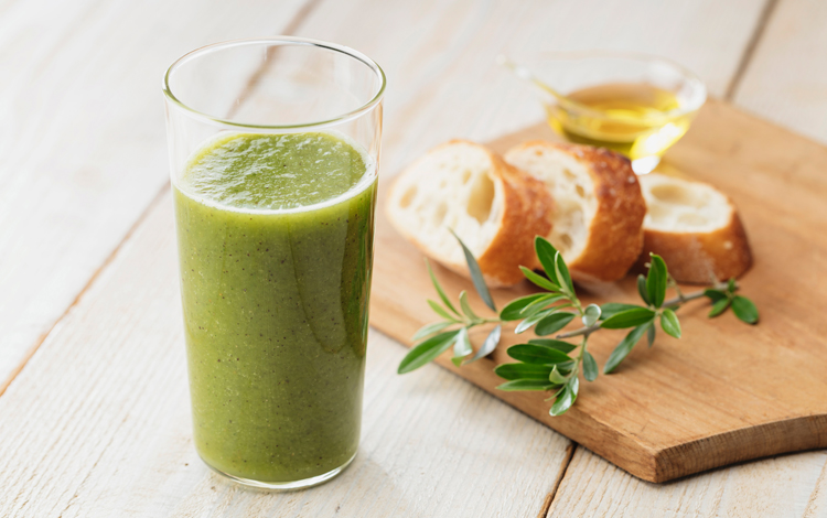 Матча, японский шпинат, киви, латук и мёд перемешивается в миксере.